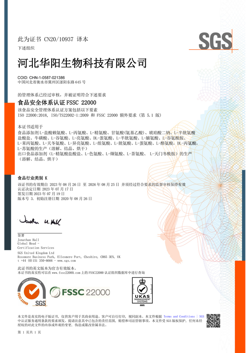 河北華陽集團坐落于河北省衡水市冀州區(qū)省級工業(yè)園區(qū)(始建于1987年,前身為冀州市華陽化工有限責任公司)。集團下屬四個公司:河北華陽生物科技有限公司、河北華悅氨基酸科技有限公司、滄州華晨生物科技有限公司、衡水市陽力商貿有限公司。主要生產甘氨酸、L-丙氨酸、L-蘇氨酸、DL-蛋氨酸、L-賴氨酸鹽酸鹽、L-半胱氨酸鹽酸鹽、干貝素等氨基酸系列食品級產品,廣泛應用于食品、飲料、飼料等行業(yè)。......